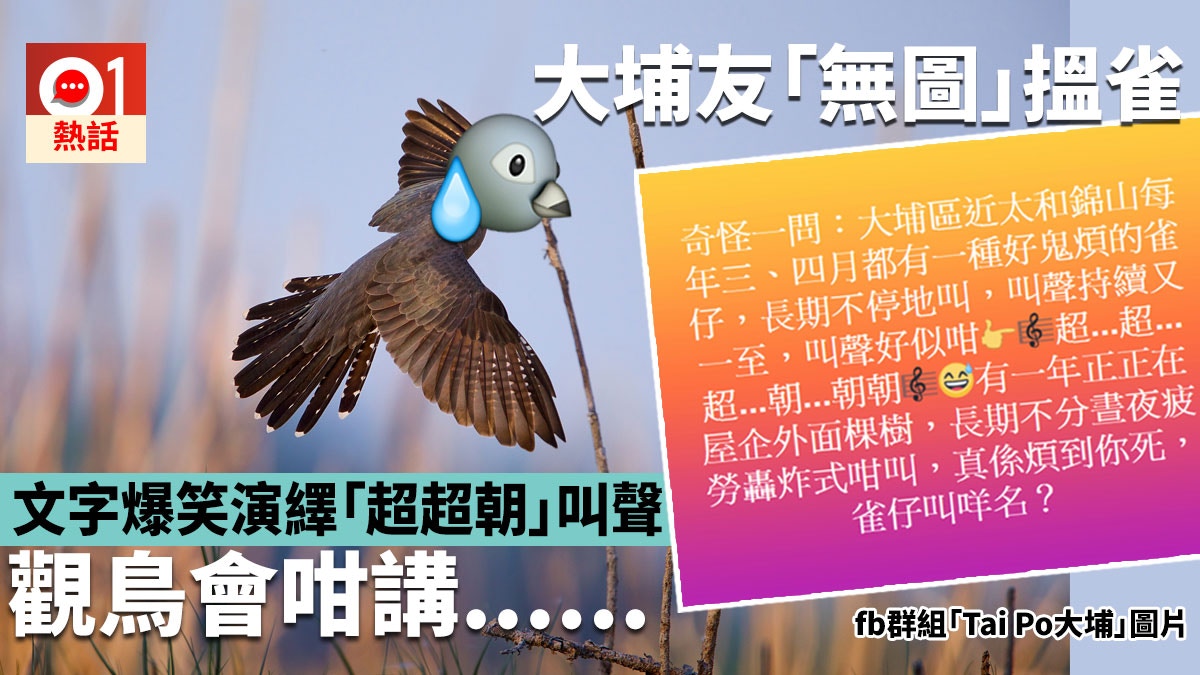每逄初夏,香港四處都能聽到雀仔叫,為石屎森林增添一點田園氣息。近日,有網民在facebook群組「Tai Po大埔」發文,問到大埔太和附近每年3、4月都有一種鳥不分晝夜地叫,持續「超超超……朝朝朝」,問誰知道這種雀鳥的名字。