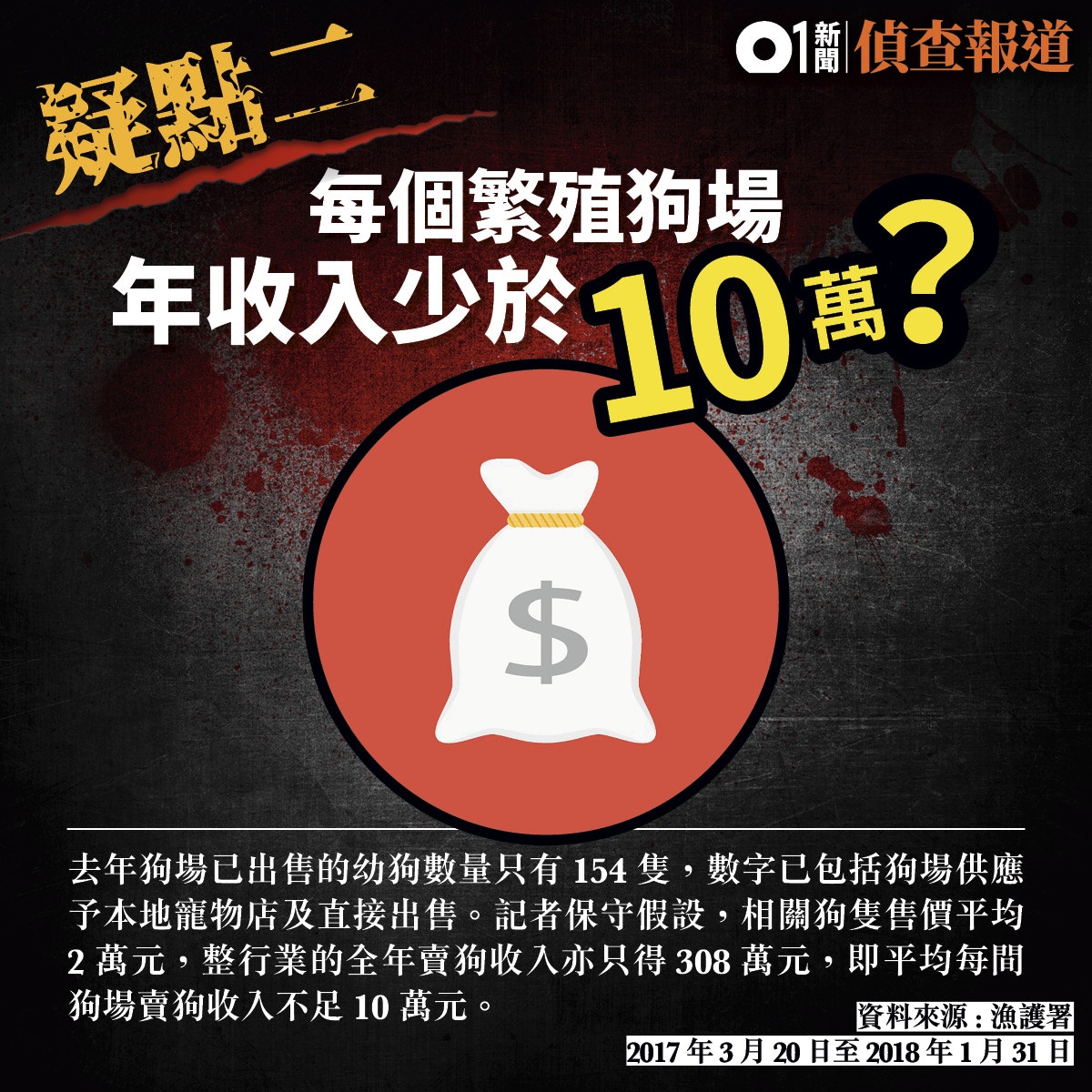 其次,狗場同期已出售的幼狗數量只有154隻,數字已包括狗場供應予本地寵物店及直接出售。記者保守假設,相關狗隻售價平均2萬元,整行業的全年賣狗收入亦只得308萬元;以現時全港31間持牌繁殖狗場計算,即平均每間狗場賣狗收入不足10萬元。