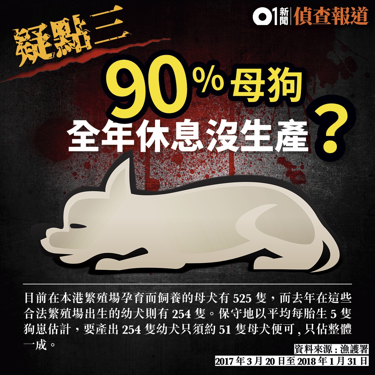 記者今年初向漁護署查詢多項持牌狗場的相關統計數字。自新修訂《公眾衞生(動物及禽鳥)(售賣及繁育)規例》(俗稱139B)於2017年3月20日實施後,截至2018年1月31日,所有持牌狗場只出產254隻狗隻,當中售出154隻,狗場飼有繁殖用途的母犬一共有525隻。記者分析發現上述數據有多個不尋常之處。