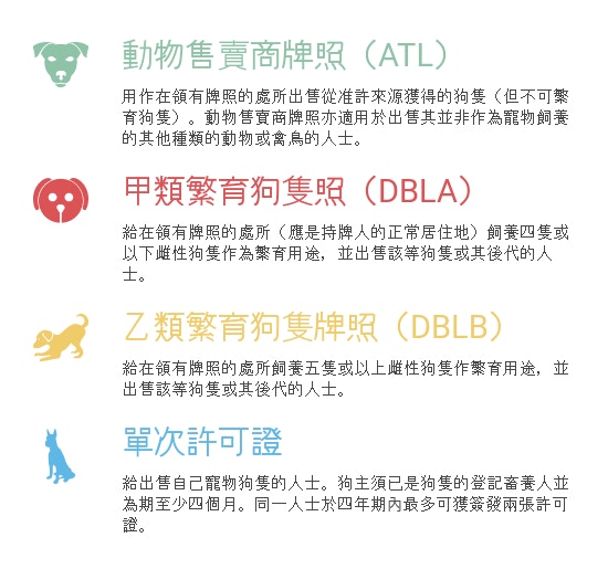 而任何出售狗隻的人士,不論該人士是否將狗隻作為寵物飼養,均須領取牌照或許可證。現時有三種牌照及一種許可證應用於規管出售狗隻,若無獲發牌照或許可證而售賣動物者,可被罰款10萬元,而違反牌照或許可證附加條款者則可被罰款5萬元。