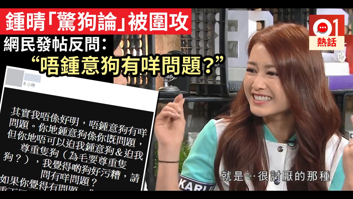 網民就鍾晴的「驚狗論」有不同意見,今日有網民在facebook群組「巴打絲打『01自由搏擊』Facebook Club」發文,稱「其實我唔係好明,唔鍾意狗有咩問題。你哋鍾意狗係你哋嘅問題,但你哋唔可以迫我鍾意狗或迫我尊重隻狗,我覺得啲狗好污糟,請問有咩開題?」,又指「如果你覺得有問題,你就順便尊重下曱甴、蛇、鼠、蟻、飛鵝、蜥蝪、蜘蛛、螳螂」。