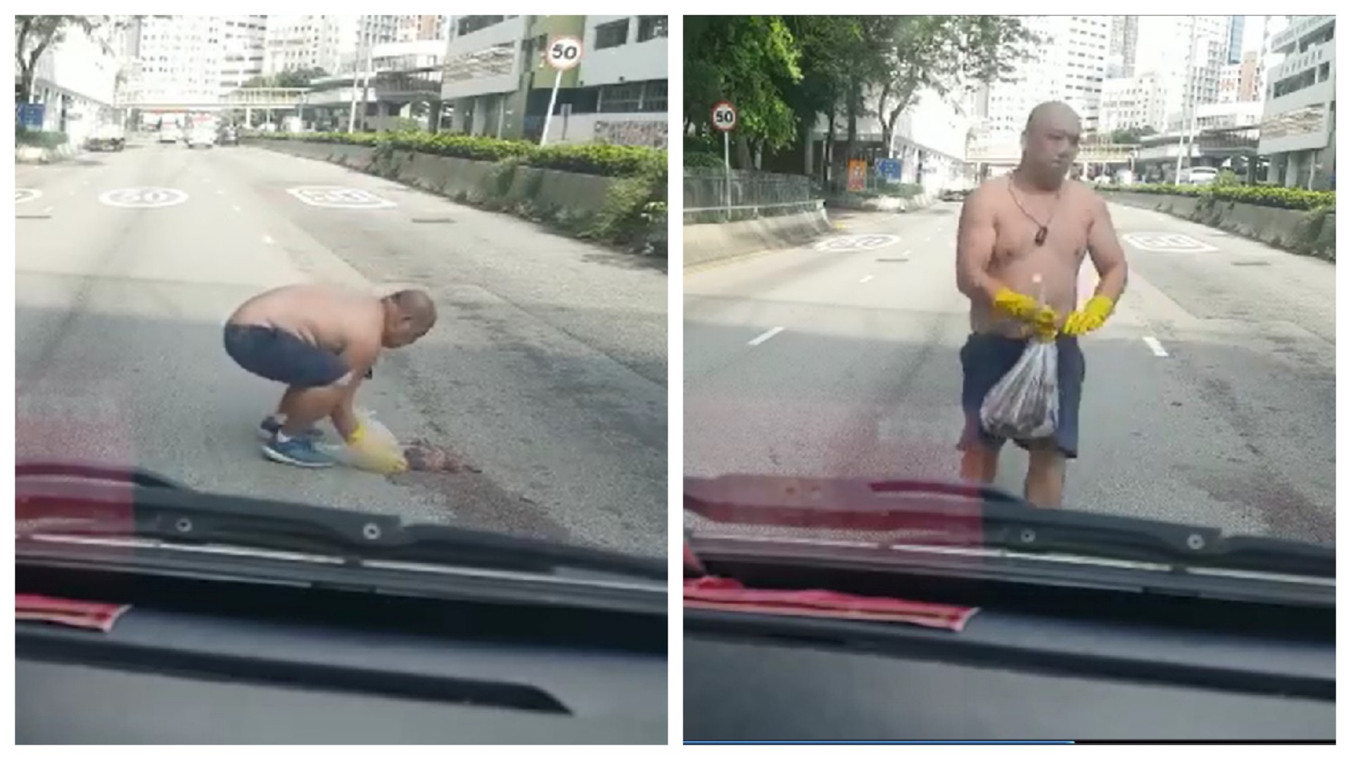片段在7月12日時上載,影片應是由車cam所拍。只見車子慢慢停在路中央,然後一名赤裸上身的男子,戴上手套及膠袋便落車,走到一團粉紅色物體旁,並將那團東西放進膠袋內,然後便迅速回到車內。