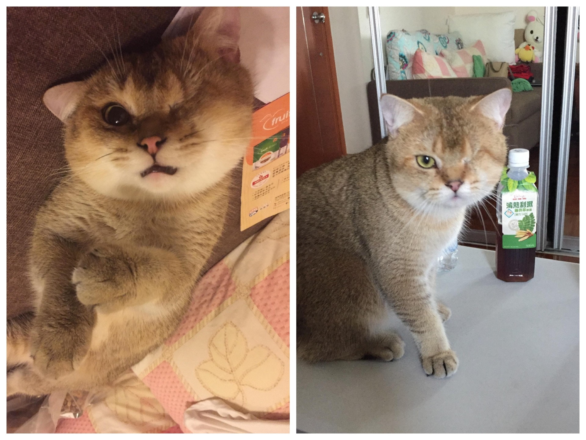 飼主孔先生指,半年前與女友在閒逛時,途經一間寵物店,發現在眾多貓咪當中,有一隻是單眼的貓咪,孔先生好奇向店主詢問:「當時店主說貓咪在小時候與同伴打架受傷,後來傷口發炎,只能整顆眼球摘除,所以就成了獨眼貓。」孔先生指,很少人願意在寵物店購入殘缺的貓咪,於是他當時馬上與店主交涉,並於一星期後到店內把貓咪買走。
