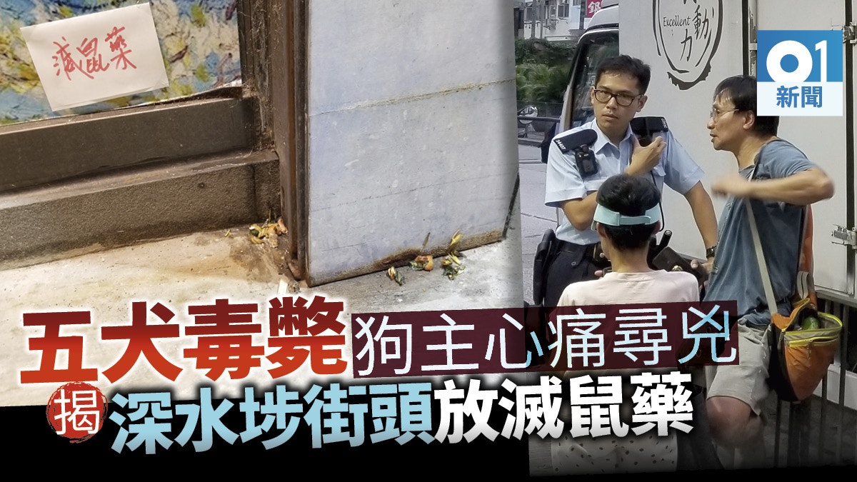 深水埗街頭疑有毒餌,五狗散步後中毒亡。今(20日)下午5時許,警方接獲市民報案,指她帶狗隻散步時,懷疑狗隻曾進食不明東西,其後死亡。該名市民懷疑有人在南昌街與基隆街交界一間食肆對開行人路隨地放置滅鼠藥,狗隻誤食後中毒亡。警方接報到場,並通知愛協人員協助調查。