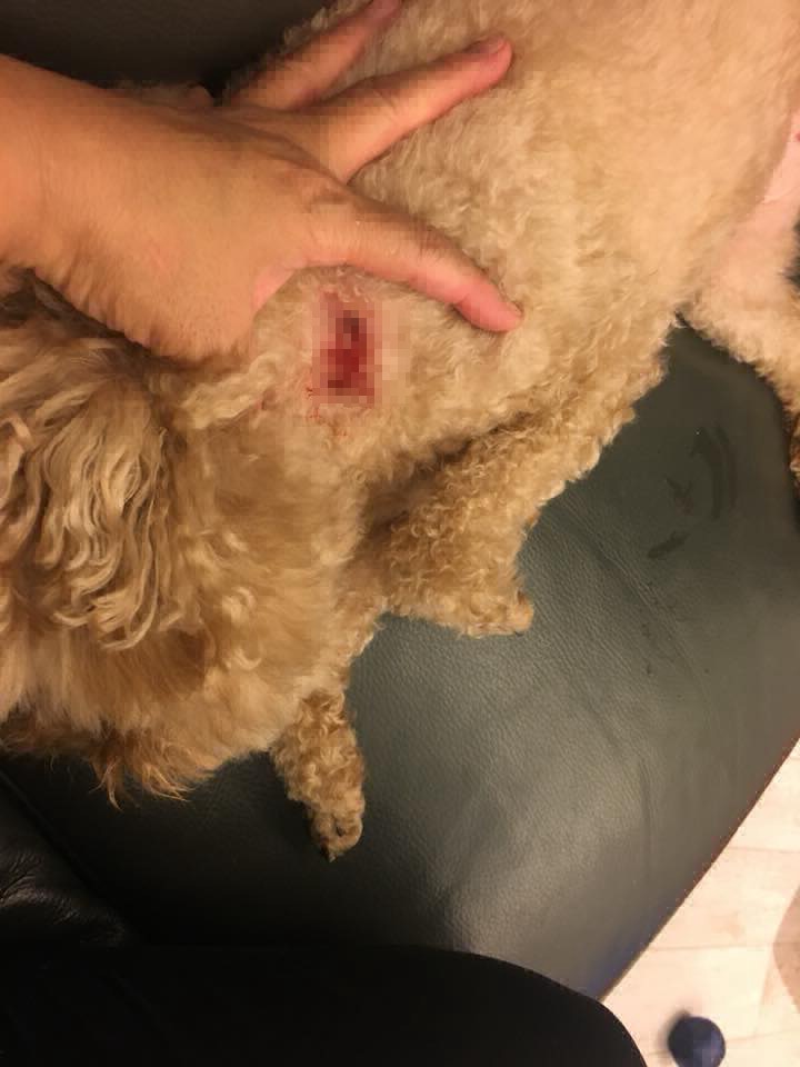 網民曾小姐指昨日(8月1日)帶愛犬貴婦狗巢巢散步,卻意外被其他寵物狗咬出一個約有一元硬幣大小的傷口,事後須進行手術縫合。