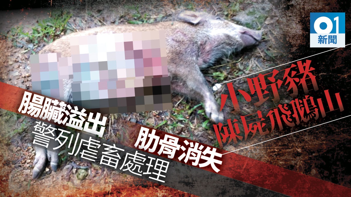昨(17日)午4時許,姓陳(51歲)男子於飛鵝山觀景亭附近行山期間,赫見一具遍體鱗傷的野豬屍體倒臥路邊,其下腹傷口潰爛,腸臟外露,男子立即報警。警方通知愛協及漁護署派員到場檢驗,證實野豬已明顯死亡,經調查後將案件列作「殘酷對待動物」處理,黃大仙警區刑事調查隊正跟進事件,野豬屍體由漁獲署檢走,稍後由獸醫解剖確定死因。