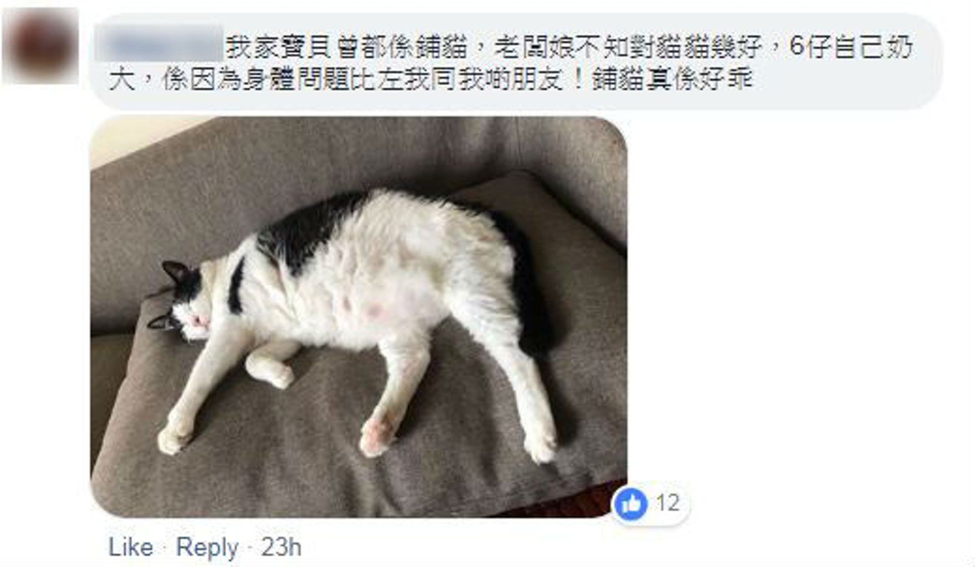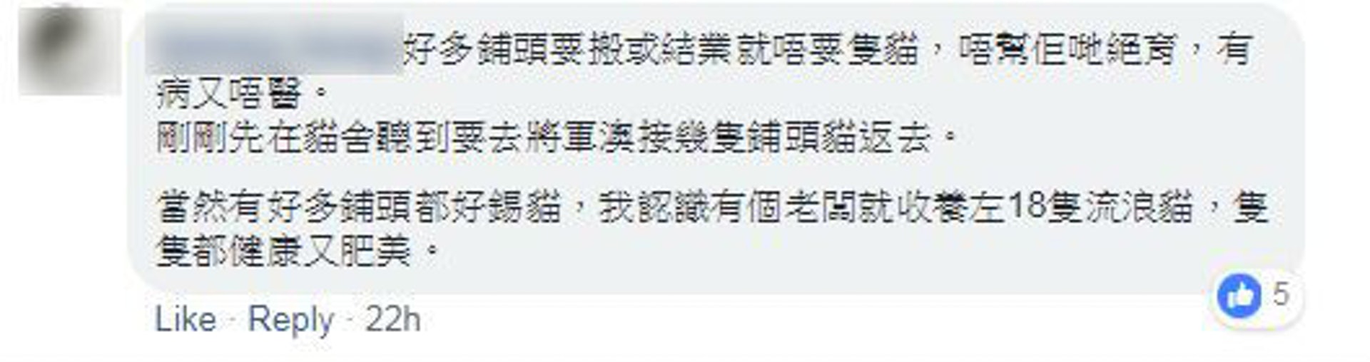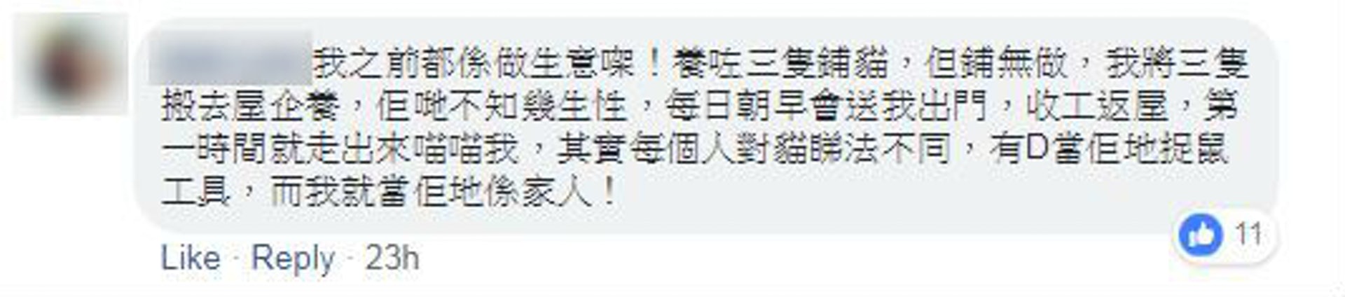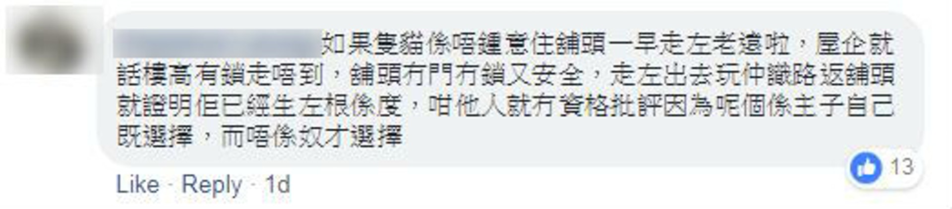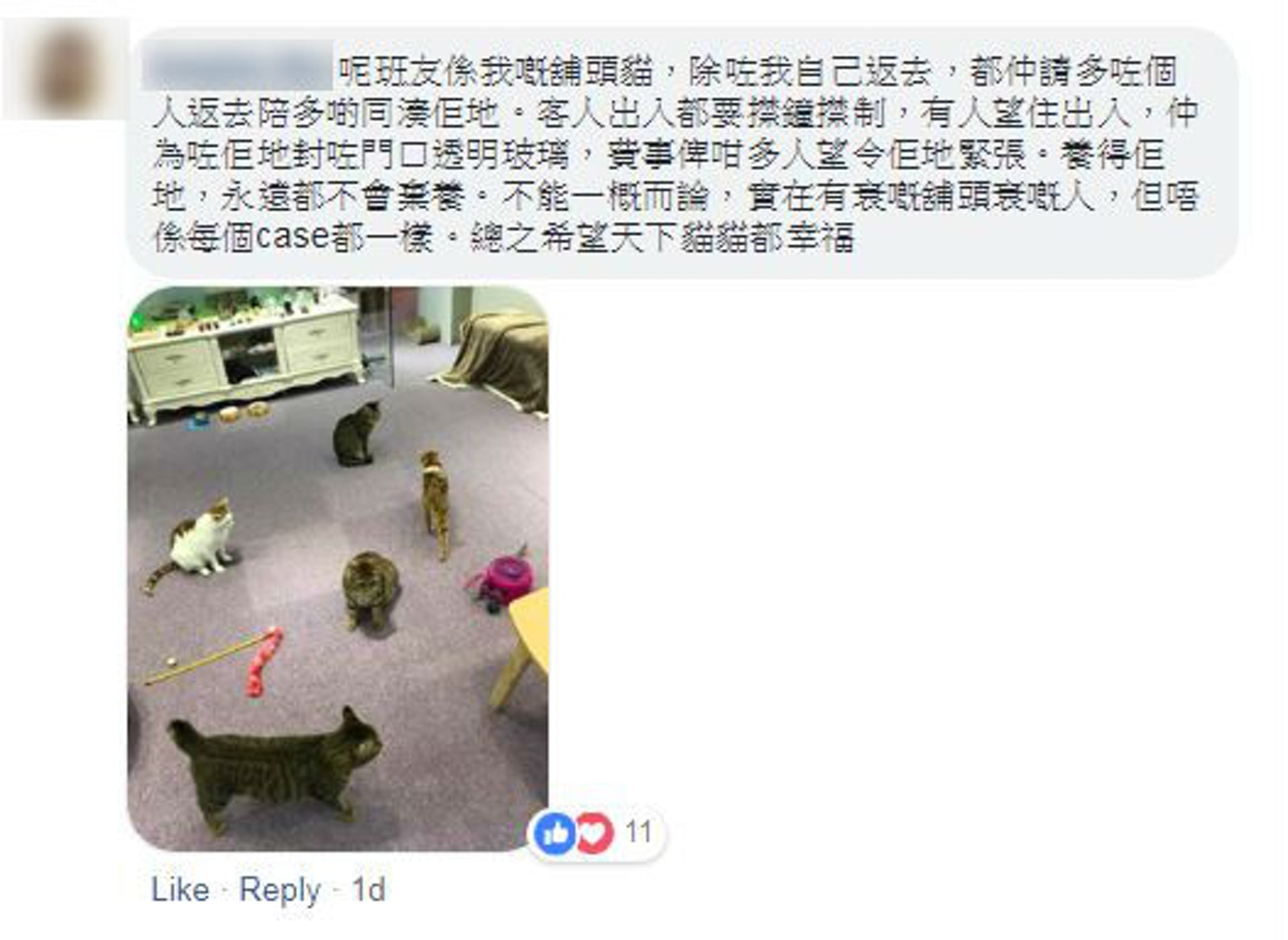 有網民在facebook群組有感而發,指眼見店舖貓相關的發文,都是「鬧多過讚」,但他認為店舖貓不比家貓待遇差,也一定比浪浪好,加上主人要上班的話,一天只有幾小時在家陪伴,「但舖貓一日十幾個鐘對住奴才,有咩咁差?」
