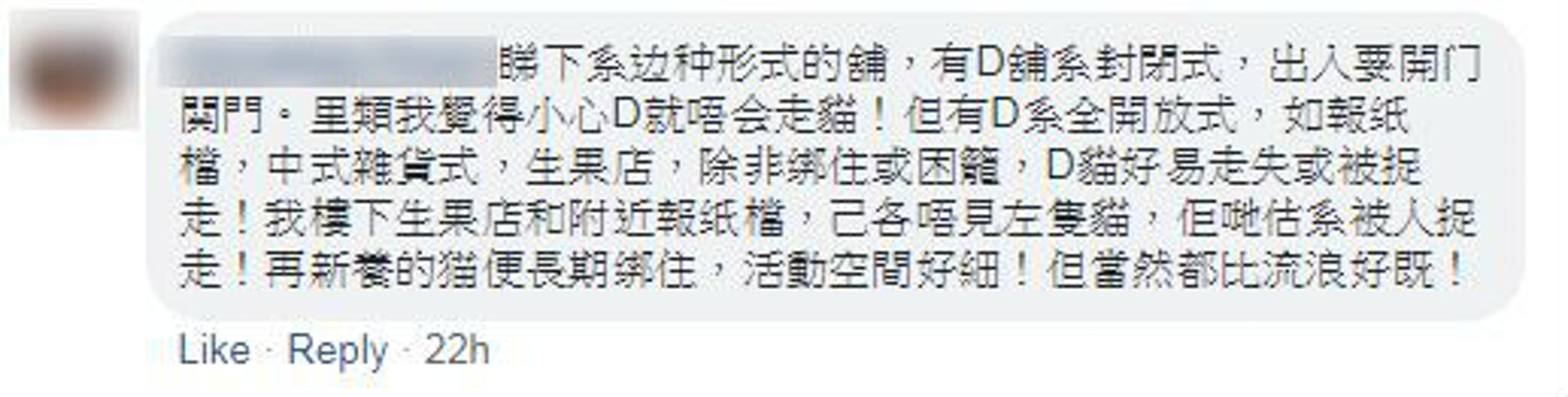 不過有網民表示,舖貓可以自由走來走去,變相增加他們走失,或者遇到危險的機會,甚至會被別有用心的人捉走,到時後悔都來不及。而收舖後的安置,亦是討論重點,有人認為舖頭貓無問題,最緊要夜晚要讓貓貓入屋,或者有入口入屋,「唔可以綁佢係屋外面」。