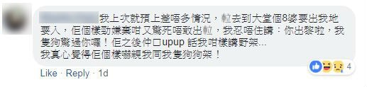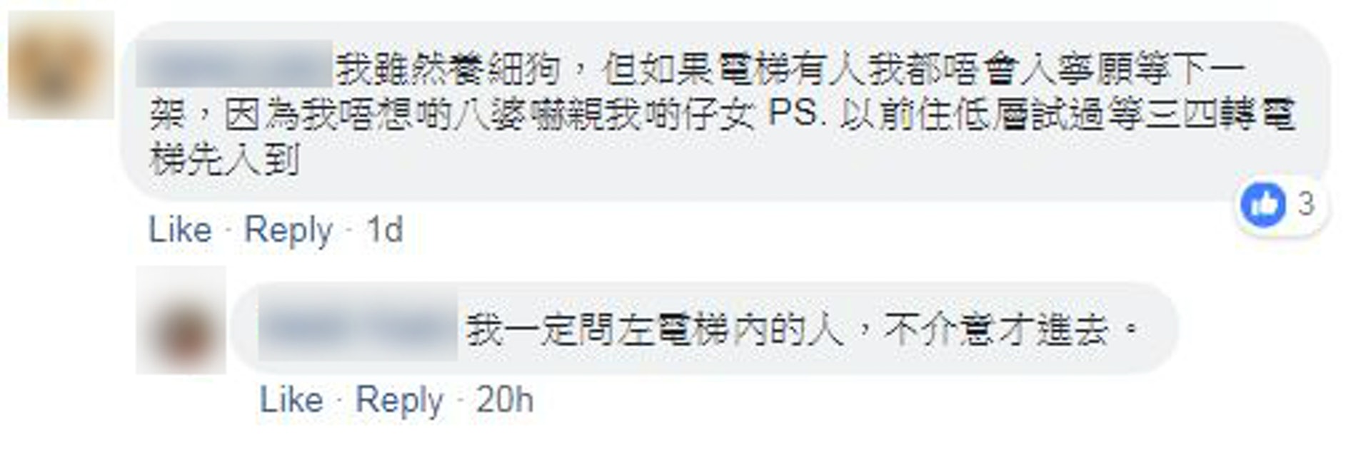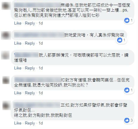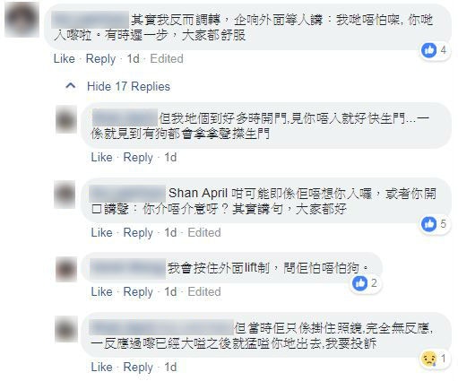 有養狗的網民表示,不時會遇上怕狗的人,進入升降機前,都會主動詢問對方是否怕狗,更試過等6、7部升降機都入不了。不過有網民認為,大廈可以養狗,本來可以各讓一步,但對方的態度如此差劣的話,就不應該讓步,以免令對方得寸進尺。