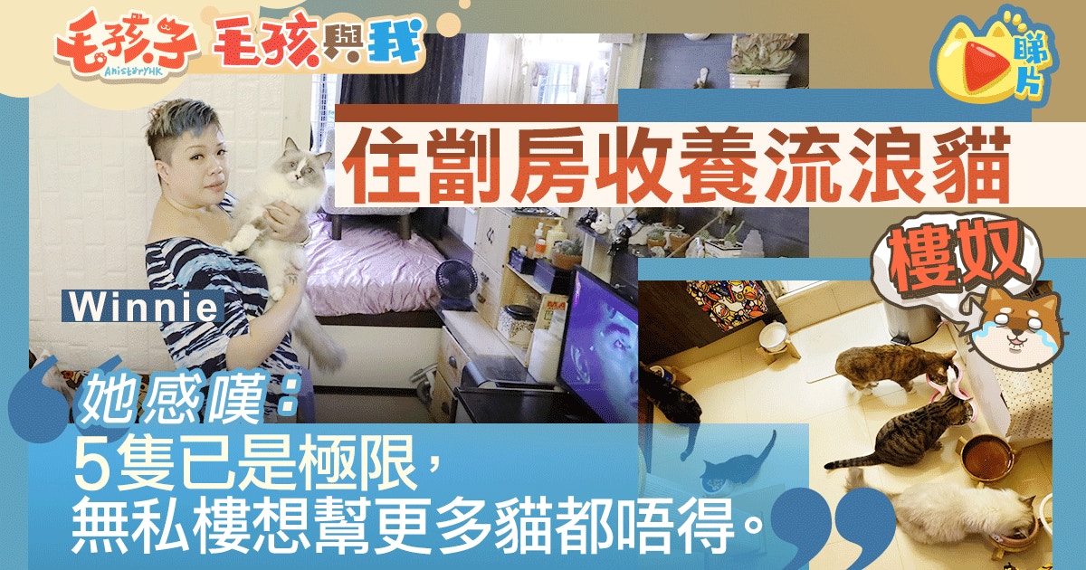 搬家後的數年,她再收養了4隻身世坎坷的貓貓。雖有義工曾建議她收養更多貓,但她堅拒:「再養多隻嘅話,佢哋就算有屋住都唔會舒服。」