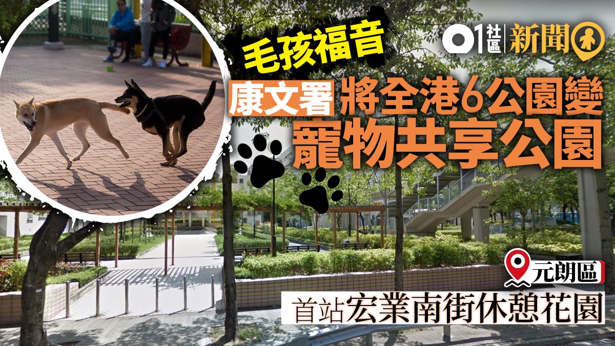 元朗的宏業南街休憩花園將成為首個人類與寵物共融的公園,現有公園設施環境將維持不變, 署方表示會加強場地清潔,亦會留意試驗計劃推行後的情況,按實際需要加設基本配套設施,例如狗糞收集箱等,以達至「寵物共享」的目的。康文署會在試驗計劃推行一年後檢討成效,以考慮設立「寵物共享公園」的需要。