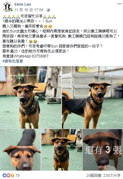 早前在Facebook群組「唐狗會學習營」有一則帖文指,唐狗Sun在兩個月內兩度被漁護署捕捉,《香港01》致電義工Irene Lau了解狗情況,「Sun係大埔公路附近流浪嘅唐狗。我哋六月底幫佢做絕育、放回。」