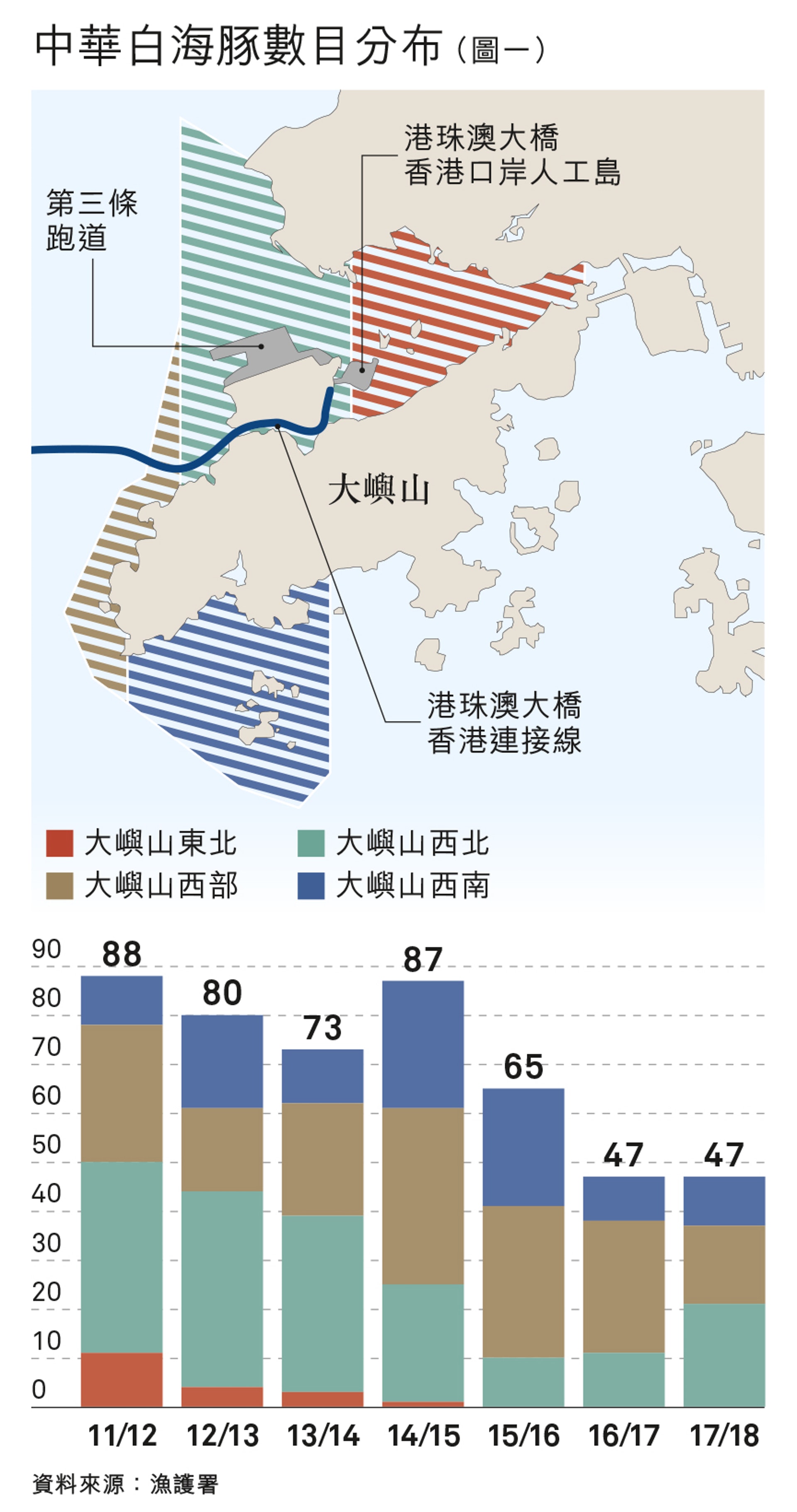 漁護署2018年公布的《監察香港水域的海洋哺乳類動物》報告揭露,在香港錄得的中華白海豚數量跌至47條,其中,大嶼山東北面水域更已連續三年不見中華白海豚身影。中華白海豚與其鄰居江豚這兩類鯨豚類動物同為香港「原住民」,但牠們的居住空間隨着城市擴展而逐漸萎縮,近年多項大型基建如港珠澳大橋及機場第三跑道,均影響牠們的棲息環境,而最壞的情況似乎仍未來臨。