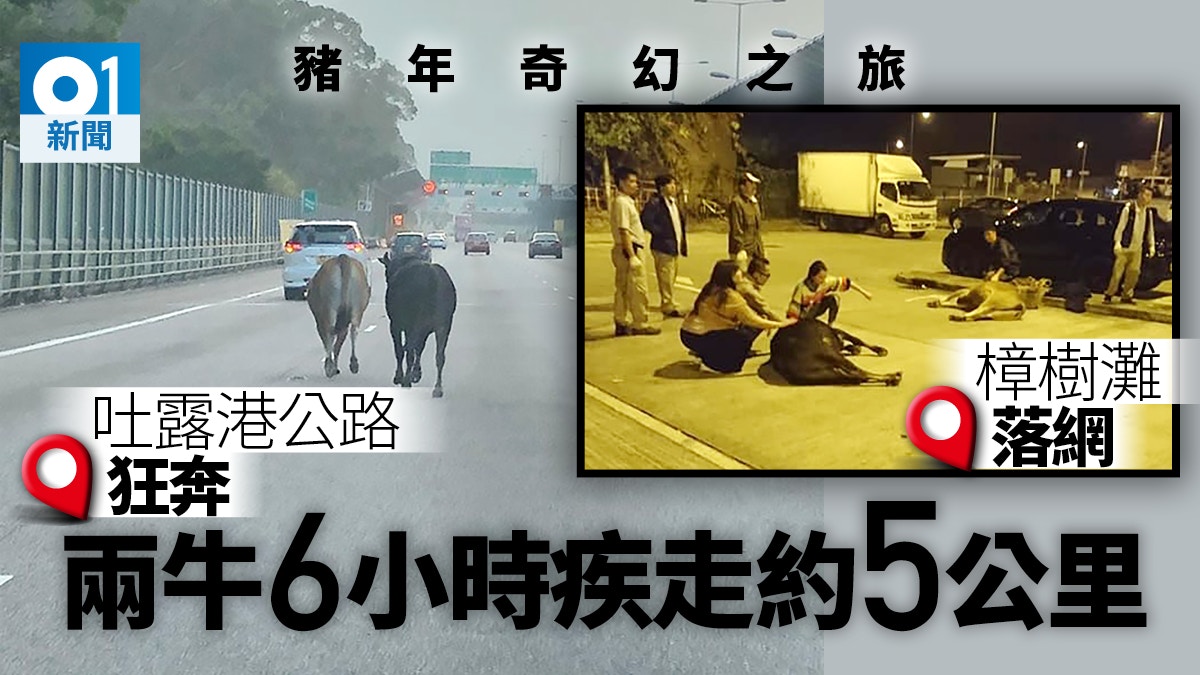 豬年大年初一(2月5日)下午約5時許,有市民發現有兩隻牛牛,竟在吐露港公路行車線上狂奔,並與其他車輛並排而走,相當危險,附近車輛見狀,均慢駛避開,以防撞及牛牛。