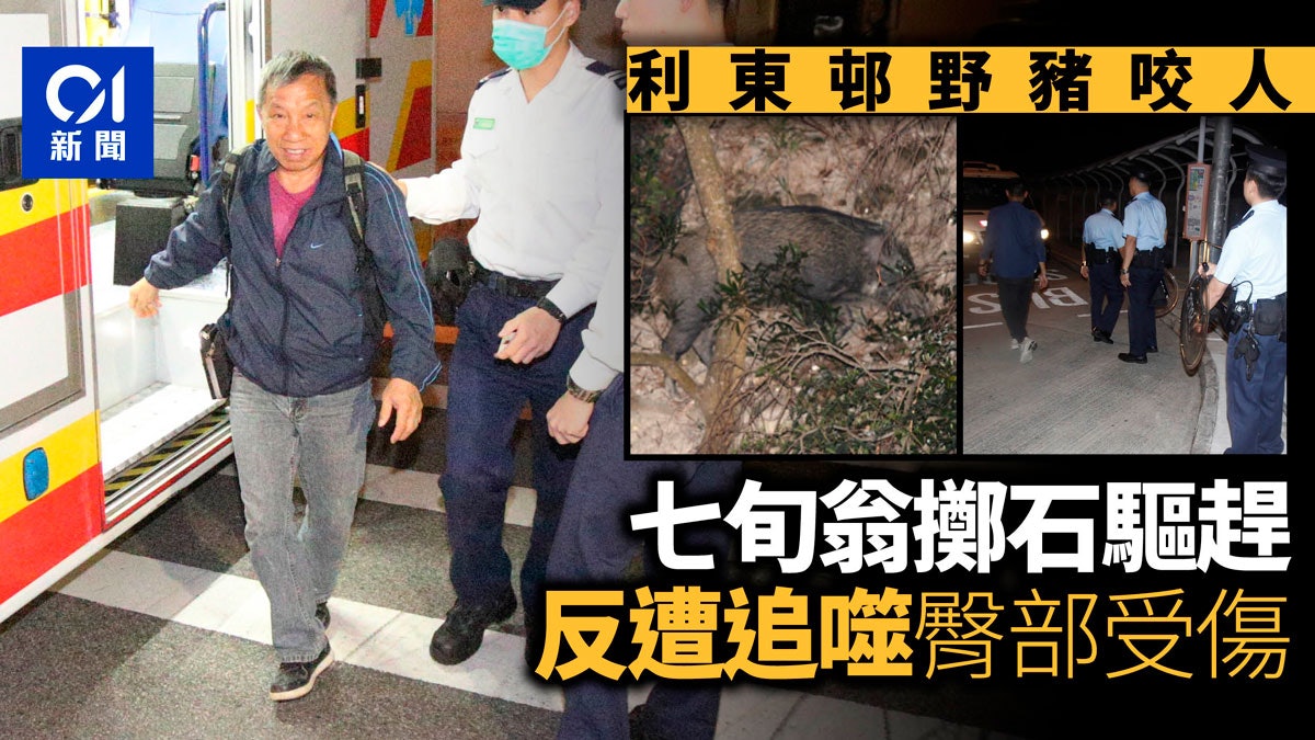 今日(4日)晚上7時許,警方接報指利東邨東業樓對開巴士站,一名姓陳(70歲)老伯被野豬襲擊,右邊屁股被咬傷,大廈姓陳(65歲)保安協助報警,由救護員將事主送往瑪麗醫院治理。警方接報持盾牌到場,並在東業樓對開山邊,發現三隻各約1米長的野豬,立即通知相關部門派員協助,其後三隻野豬自行離去。