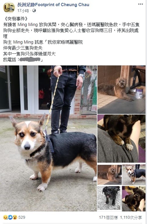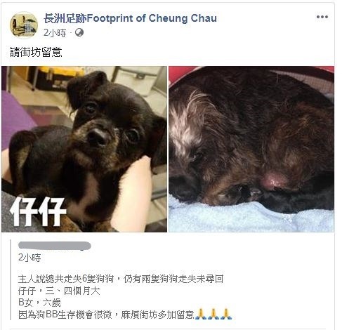 昨日報道過長洲走失狗事件,熱心網民譚小姐在長洲東灣附近遇見兩隻走失小狗,帶回家暫托並且在Facebook發文希望其他網民幫忙尋找主人,經過網民及長洲居民的熱心幫忙,事件有新進展!事緣一名狗主放狗時突然心臟病發暈倒,一下子走失了所有狗狗,而其中兩隻相信就是譚小姐所遇到的狗狗,不少網民對此事件都十分關心,紛紛在Facebook上廣傳消息,希望能夠幫助狗主和狗狗團聚。