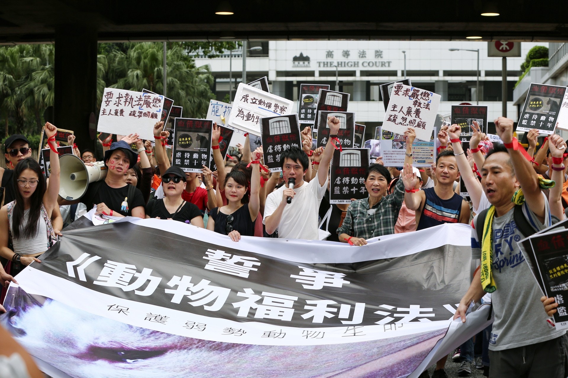 多名市民下午兩時半於中環遮打花園集合,遊行至政府總部,參加者沿路高叫「虐待動物,監禁十年」等口號,他們更手上更繫上紅絲帶,代表被人虐打虐殺動物所流的血,不希望再有殘酷動物事件發生。