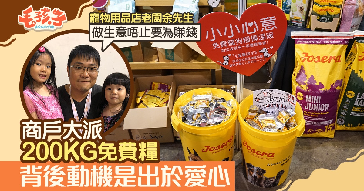 參展商余先生是攤檔的負責人,是次免費派糧亦是他的主意。余先生表示,今次預留了多達200公斤的貓狗糧於會場派發,所有人也可任意取走貓狗糧,毋須任何附帶條件。在這利字當頭的社會,這分善心似乎慷慨得令人訝異。問及會否擔心被人佔便宜,余先生笑言:「唔驚得咁多,如果個個都驚咁咪無人做?人同人之間都係講個信字。」