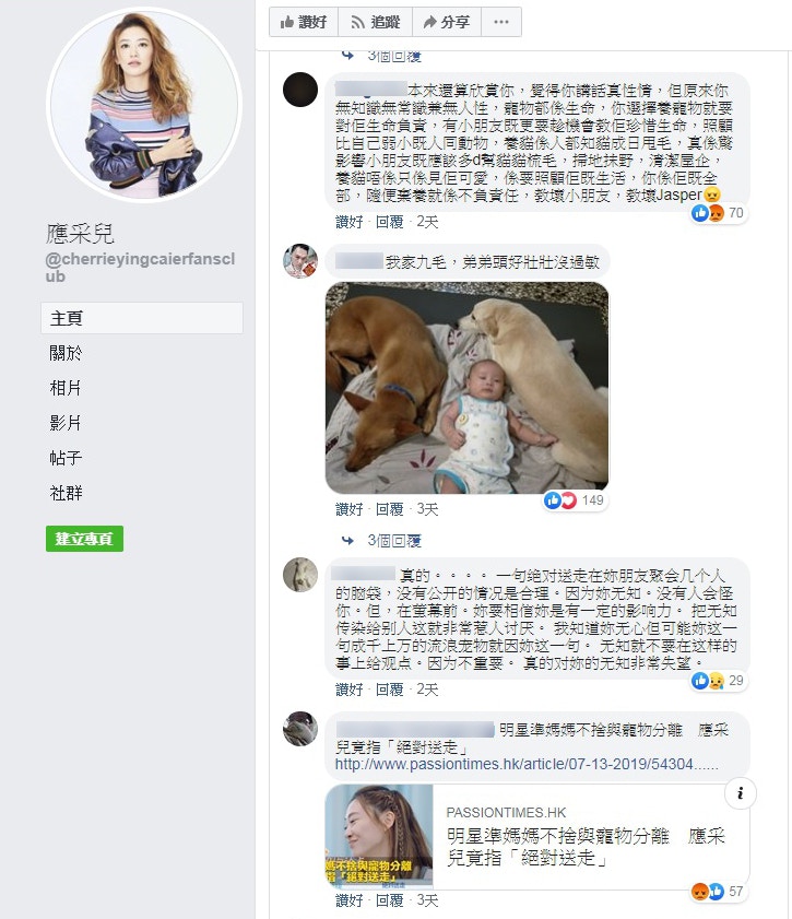 「原本很喜歡妳,覺得妳在帶孩子上很有想法,是個很棒的媽媽,可是看到妳節目上的棄養寵物言論……除了難過與震驚,更多的是失望」、「寵物不是孩子的過敏原,孩子可以去測過敏原。這麼輕易的請人家把貓送走,不知道同理心何在。」、「這樣無知的言論會造成多少棄養,您不會良心不安嗎?」、「身為公眾人物,我不認為妳可以隨便說話,沒有任何醫學背景就一句話打死多少寵物,曾經喜歡妳教孩子的方式,但在關於寵物這件事情上妳錯了!身為爸媽身教很重要,如果養了就要負責到底,不是鼓勵朋友送走寵物,環境打掃、購買空氣清淨機這類的事情很輕易就做到,為什麼妳要亂說話!到底為什麼說話不經過大腦!」網民不滿的留言一直持續,甚至在應采兒的fb專頁不斷炮轟。