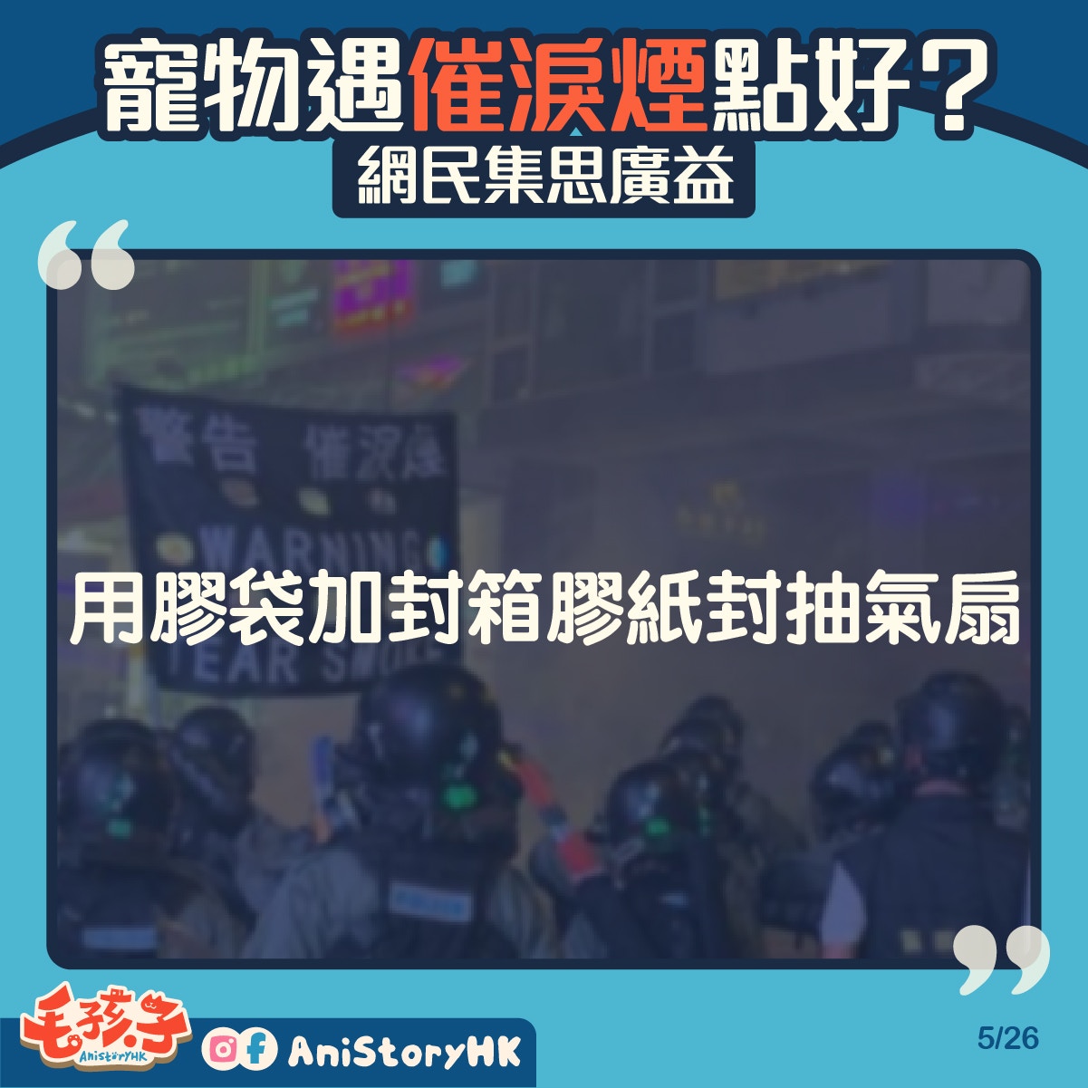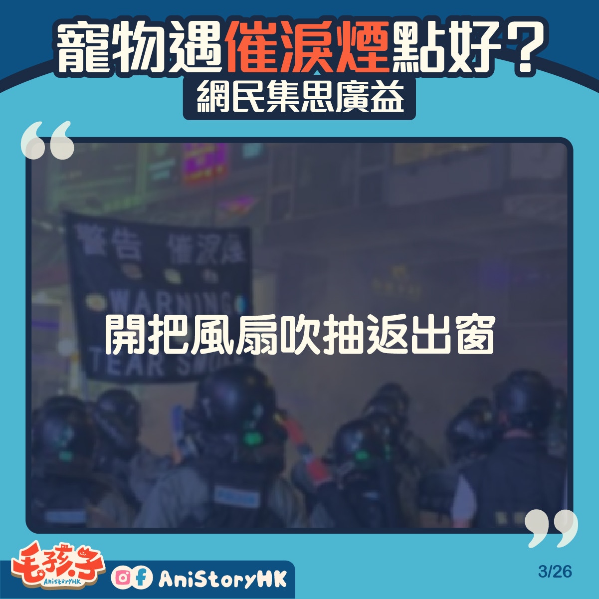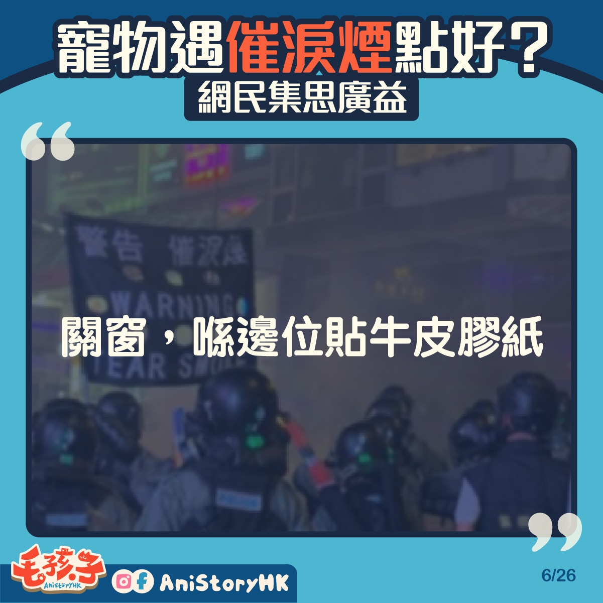 不少網民於facebook群組發文求助指,假如催淚氣體飄進屋內,可以怎樣保護貓狗?有執業獸醫指,可以準備生理鹽水為貓狗沖洗眼睛、皮膚,如貓狗持續呼吸困難、舌頭呈淺紫色,便應立即帶牠到就近獸醫診所求診。