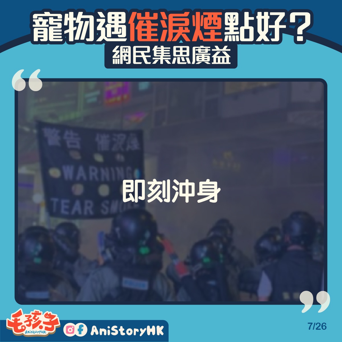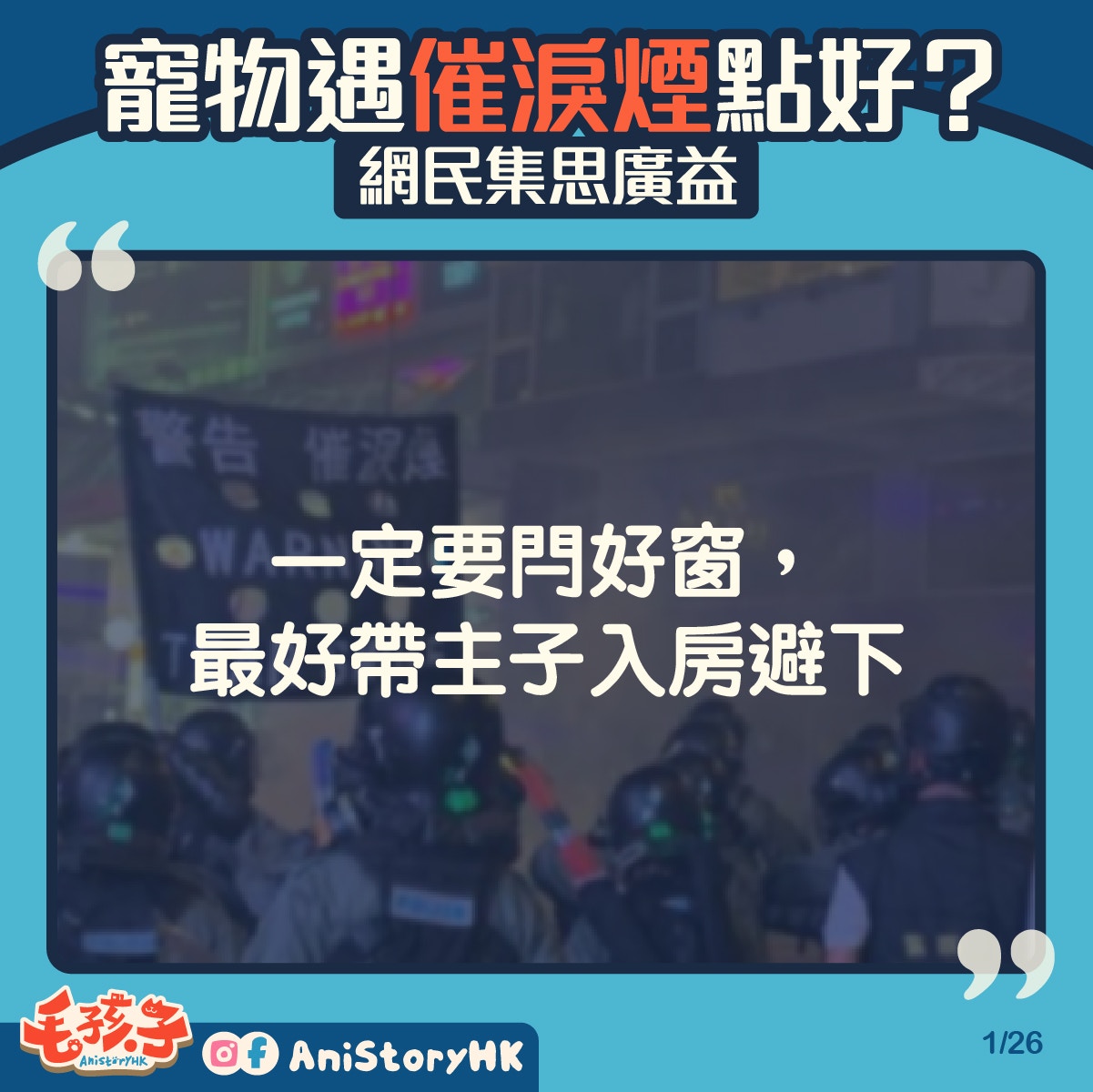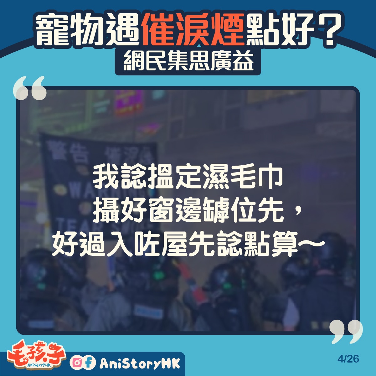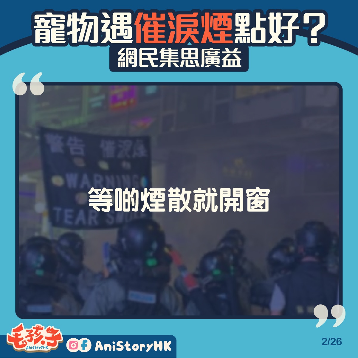 不少網民於facebook群組發文求助指,假如催淚氣體飄進屋內,可以怎樣保護貓狗?有執業獸醫指,可以準備生理鹽水為貓狗沖洗眼睛、皮膚,如貓狗持續呼吸困難、舌頭呈淺紫色,便應立即帶牠到就近獸醫診所求診。