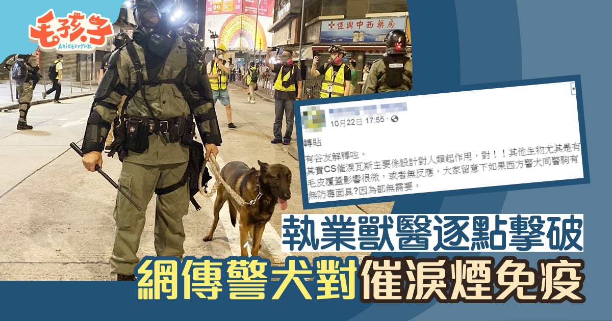 網上有流傳指「警犬是天生對催淚氣免疫的」,其發文經大量網民轉貼,為了查明其真確性,《香港01》向兩位本地執業獸醫求證,結果獸醫一致認為有關內容有誤。其中執業獸醫張翠玉更直指散播此說法的人:「非常不負責任。」