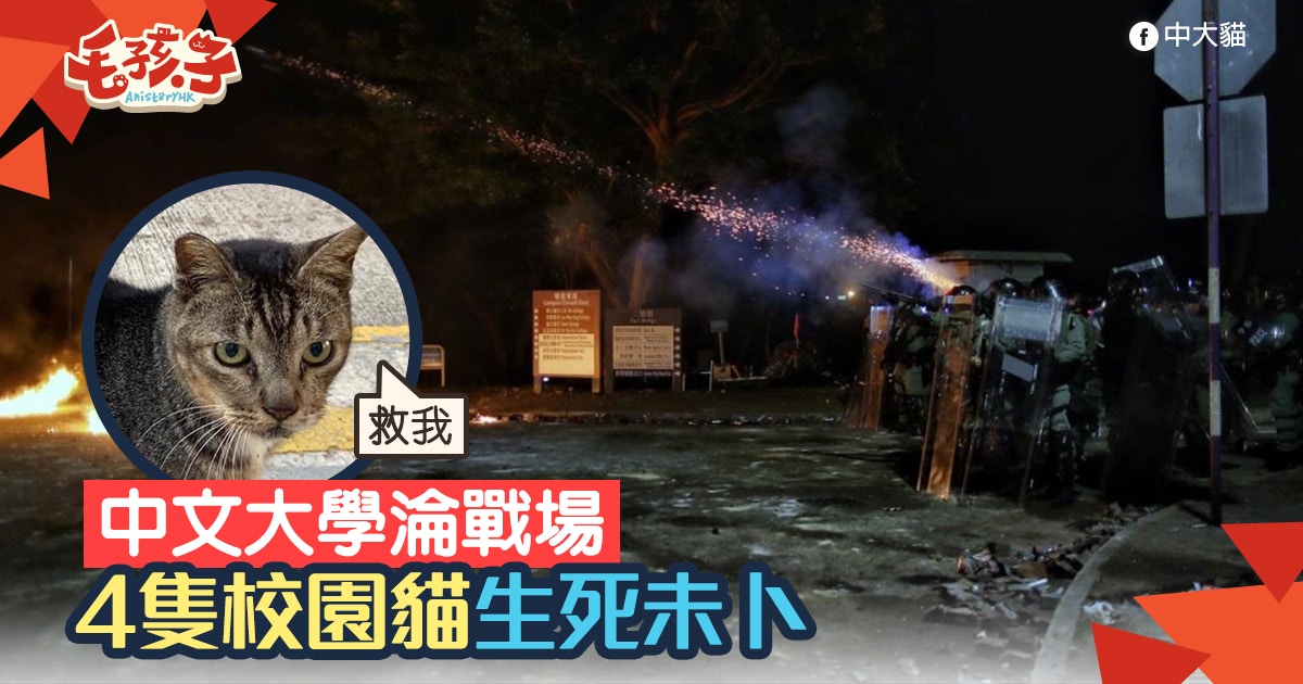 防暴警員昨天(11月12日)於中大二號橋位置與黑衫人爆發激烈衝突,警方向校園狂射催淚彈、橡膠彈及布袋彈,釀成最少60人受傷。中大校園同樣是貓咪的棲息地,約有20隻貓咪在校園不同地方出沒。據中大貓facebook指,目前有4隻貓咪下落不明,至今生死未卜。