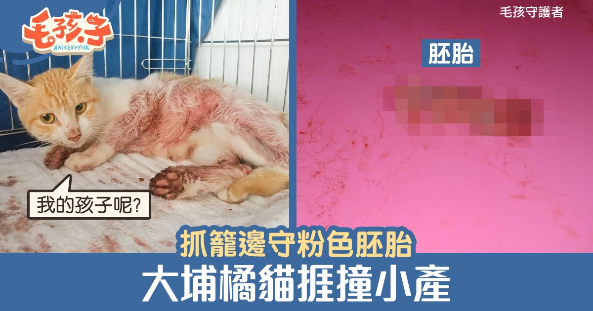 日前,有橘貓在大埔公路遇到交通意外。本地動保團體「毛孩守護者」及後到場,把貓咪送往診所。醫護人員打開貓籠時,橘貓竟然反常態抓著貓籠不放,細看下發現牠的身後有一個小小的胚胎......