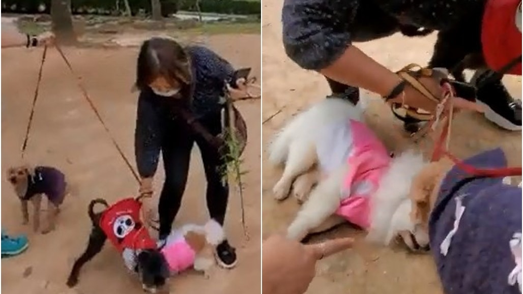恐怖狗咬狗|雙方爭執期間,中年婦的貴婦狗突咬「自己友」松鼠狗。(網上影片截圖)
