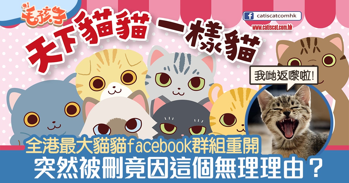全港最多貓奴加入的facebook群組「天下貓貓一樣貓」上星期四(10月15日)下午3時許突然被fb刪除。版主Antony Leung與fb交涉多日後,群組終於在前日(10月19日)下午5時許解封。Antony指,群組被刪懷疑是因為一個無理原因。